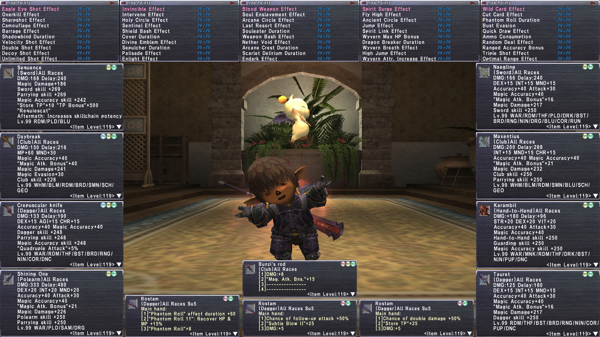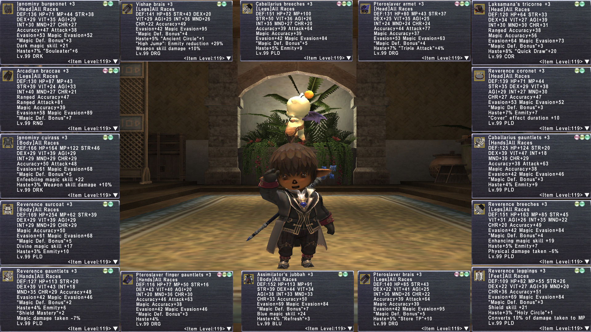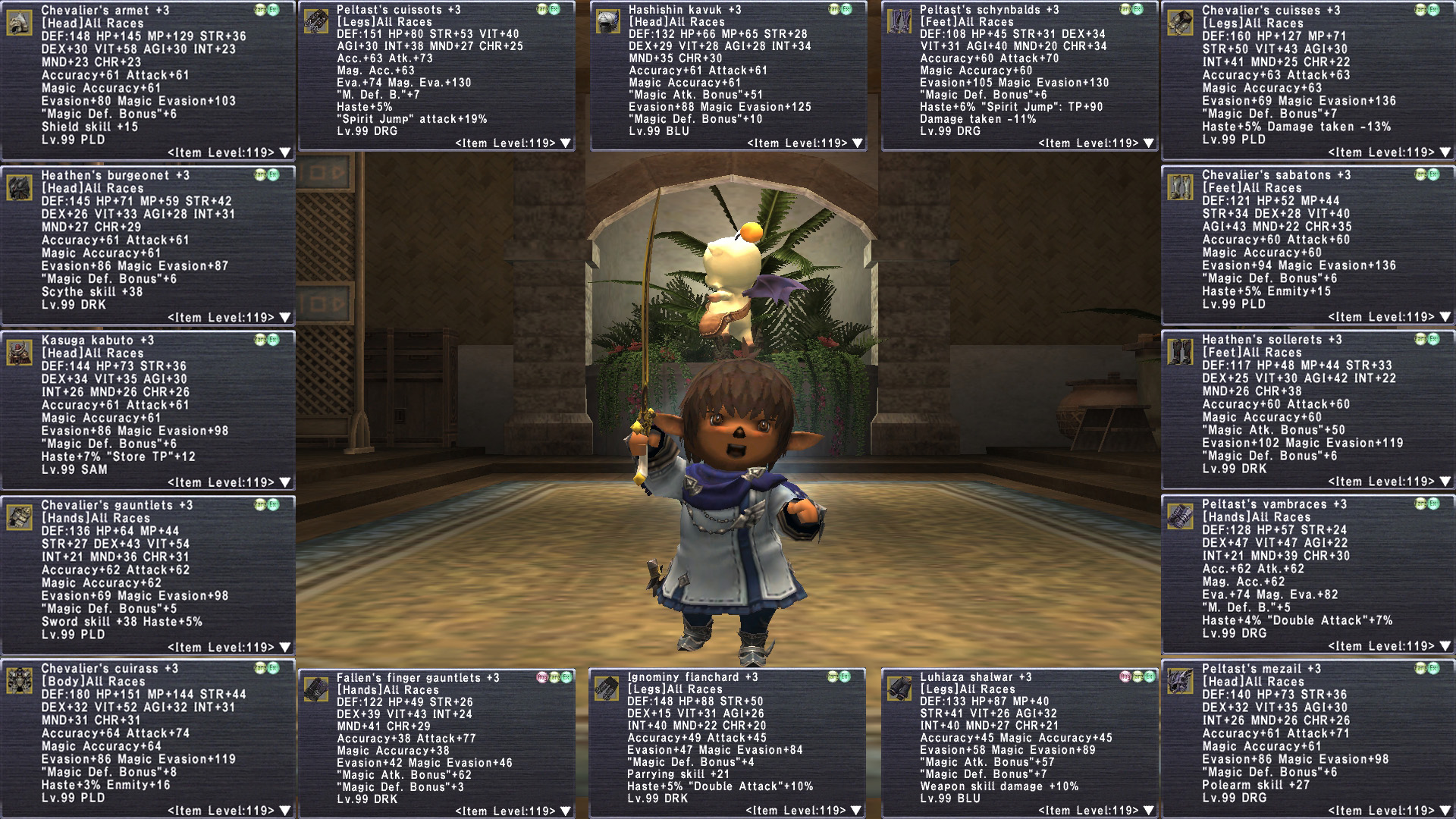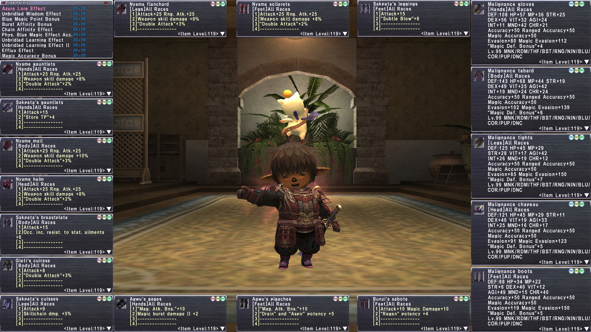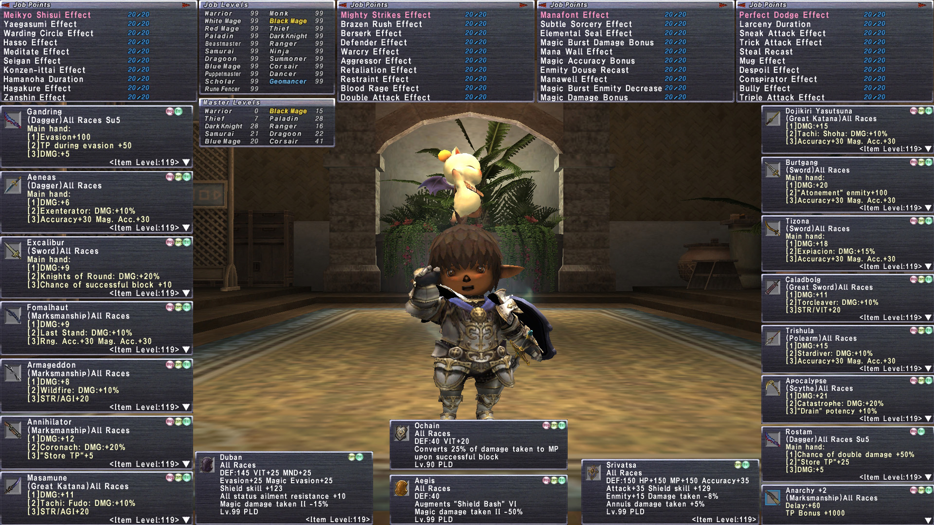 tldr Beast little Taru, Great selection of REMA Corsair looking really good. DP in progress, 3x Rostam. Full 4/4 Null. Full Malignance. Doji/Masa Samurai, Burtgang/Excal/Aegis/Ochain/Srivata PLD. Tizona BLU with great spells. Trishula DRG. Apoc/Calad Dark Knight. Lots of emp+3 from Sortie. lots of Su5+2 necks. Tons of Unity+1 ranked. Proper Omen including 5/5 Bodies, 7x Regal/Ambu weapons and JSE backs. Full Crep including Knife and Cloak. Mastery Rank 6, so you know this is a proper build! Over 580k Muffins and 93k Mog segment on hand with 100 Trusts!