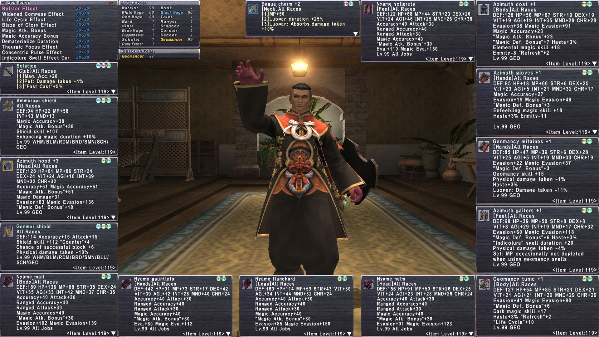 tldr Purpose built GEO on Asura. all spells. also has 99 RDM. Azimuth hood+3, reforged+1 af/relic/emp. Limbus Murky/Alabaster. RoV. Base Nyame. Some Omen. handulf of unity pieces Defending ring. RoV complete. 60k+ Limbus points.
