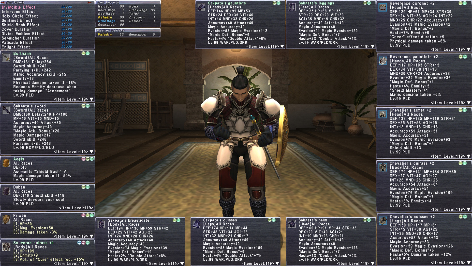 tldr purpose built Asura Paladin with mythic Burtgang and Aegis. Reforged+1/2/3. Base Ody Sakpata with lots of Mog segments on hand. 140k Galli on hand. Volte body. Couple of Ambu backs.Strong Enmity set. Basic GEO, mastered. Murky/Alabaster with some Limbus points. RoV and TVR are complete.