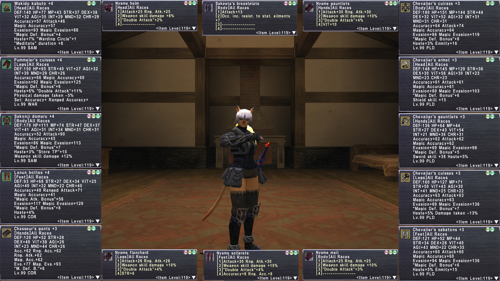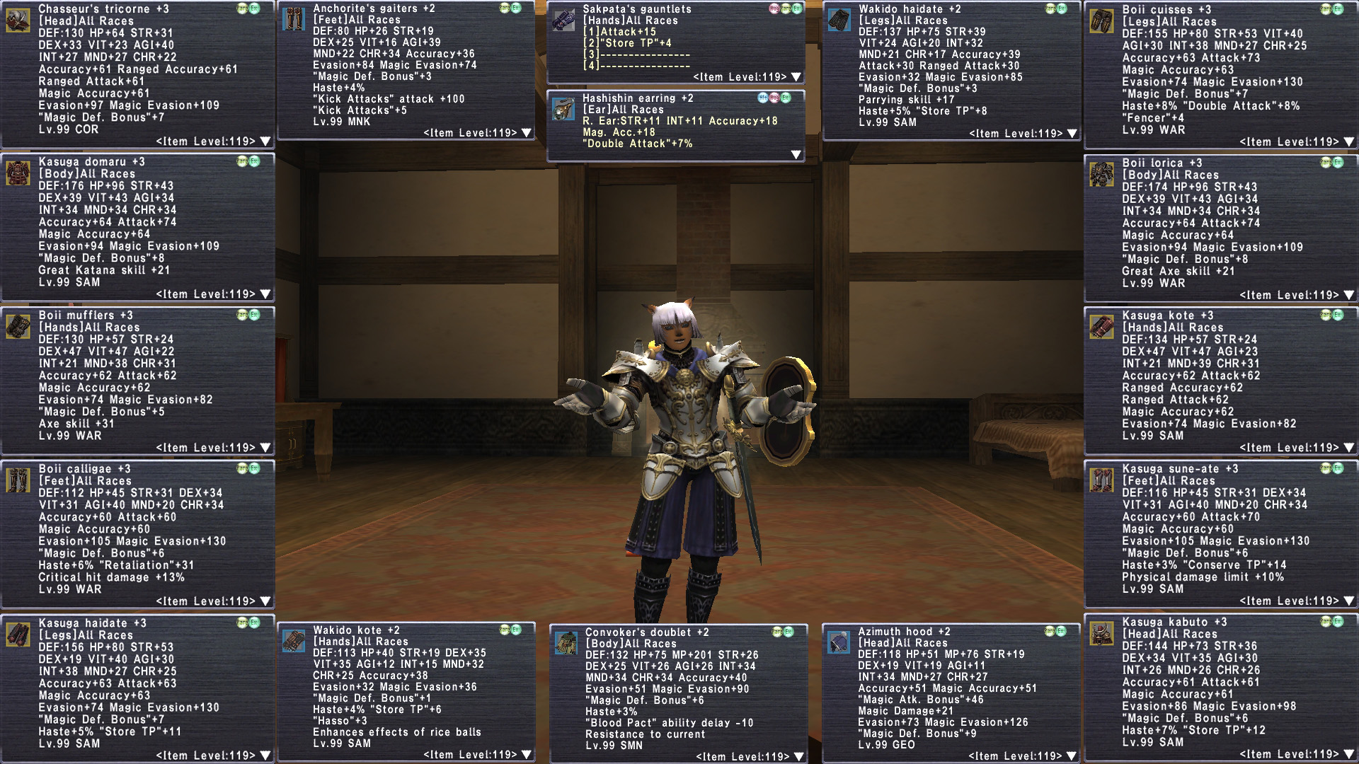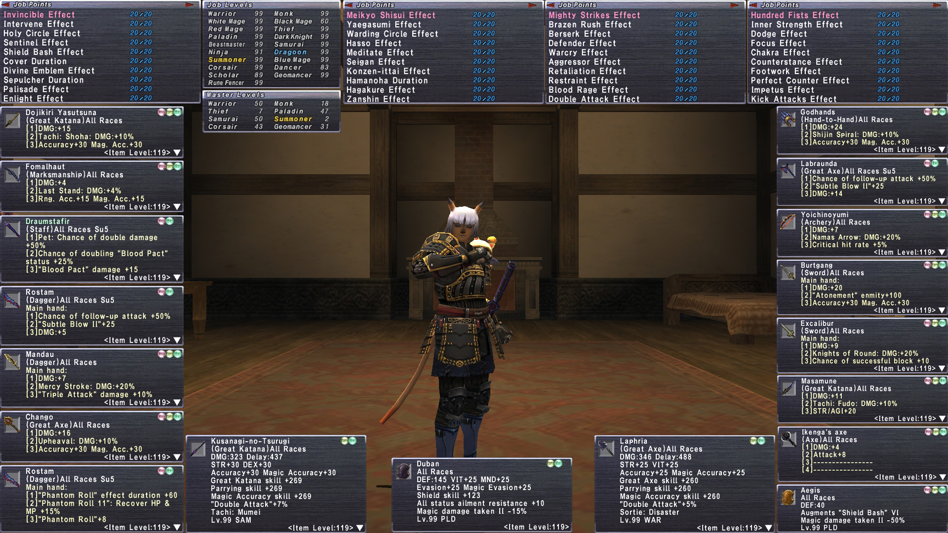 tldr Top Shelf ML50 Samurai with Stage 4 Prime. R15 Masa/Doji. Aegis/Burtgang/Excal. Chango/Savage ML50 WAR. Godhand Monk. Fomal 2x Rostam COR and more. Good Sortie+3. Ody Nyame@25. Su5+2 necks. Good Omen including Ashera. Unity+1@r15. Domain Invasion. TP Bonuis Gun/Dagger. Full Malig. 3x Null gear. 130k Mog Segs. 1.27m Gaillmaufry/5m for Stage 5 Prime. Misc limbus currenciues. gearswaps available. Missions done including RoV and tVR