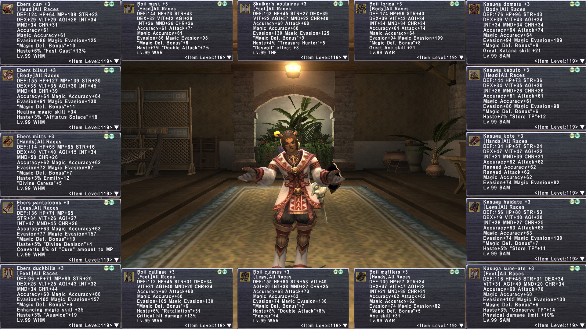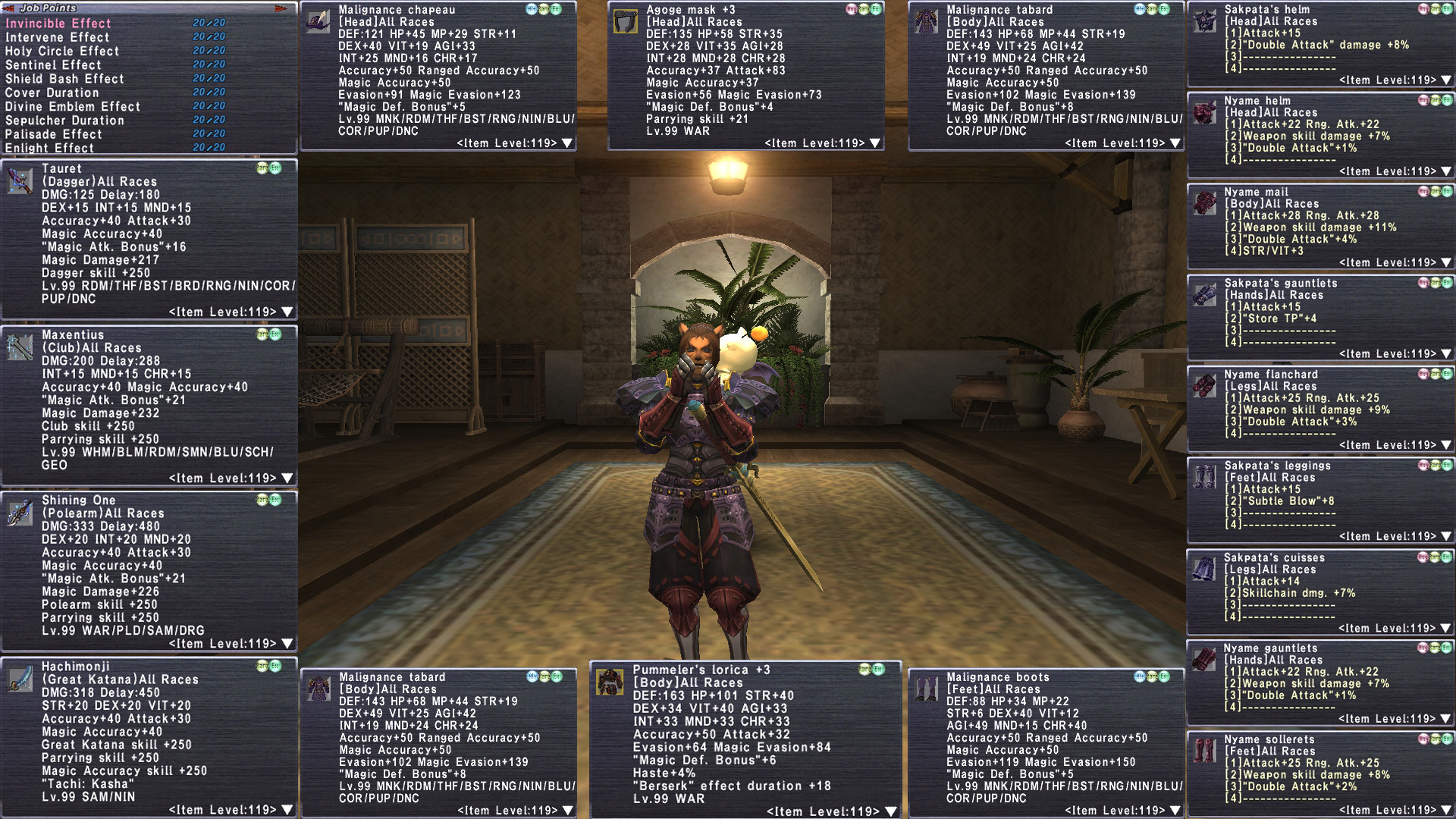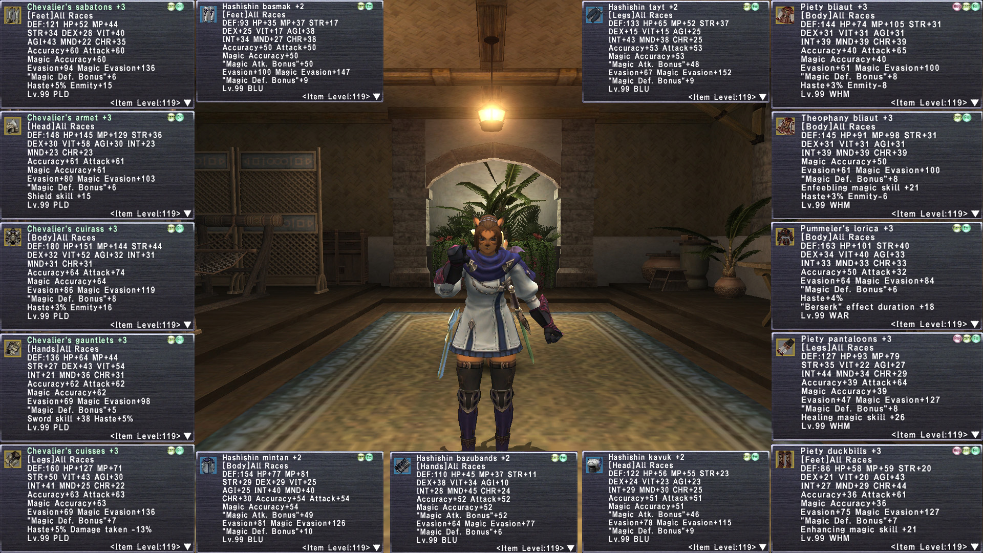 tldr Nice simple versatile Mithra, Tank class, DD war and sam, WHM healer. Blue with spells. Very capable with reforged+3, couple pieces of null, full malignance, Missions done including RoV and tVR. Nyame is opened to r25. several pieces of Volte. Su5+2 necks. JSE Backs for BLU/PLD/SAM/WAR/WHM. Strong ML. 129k Mog Segment, 525 Gallimaufry.