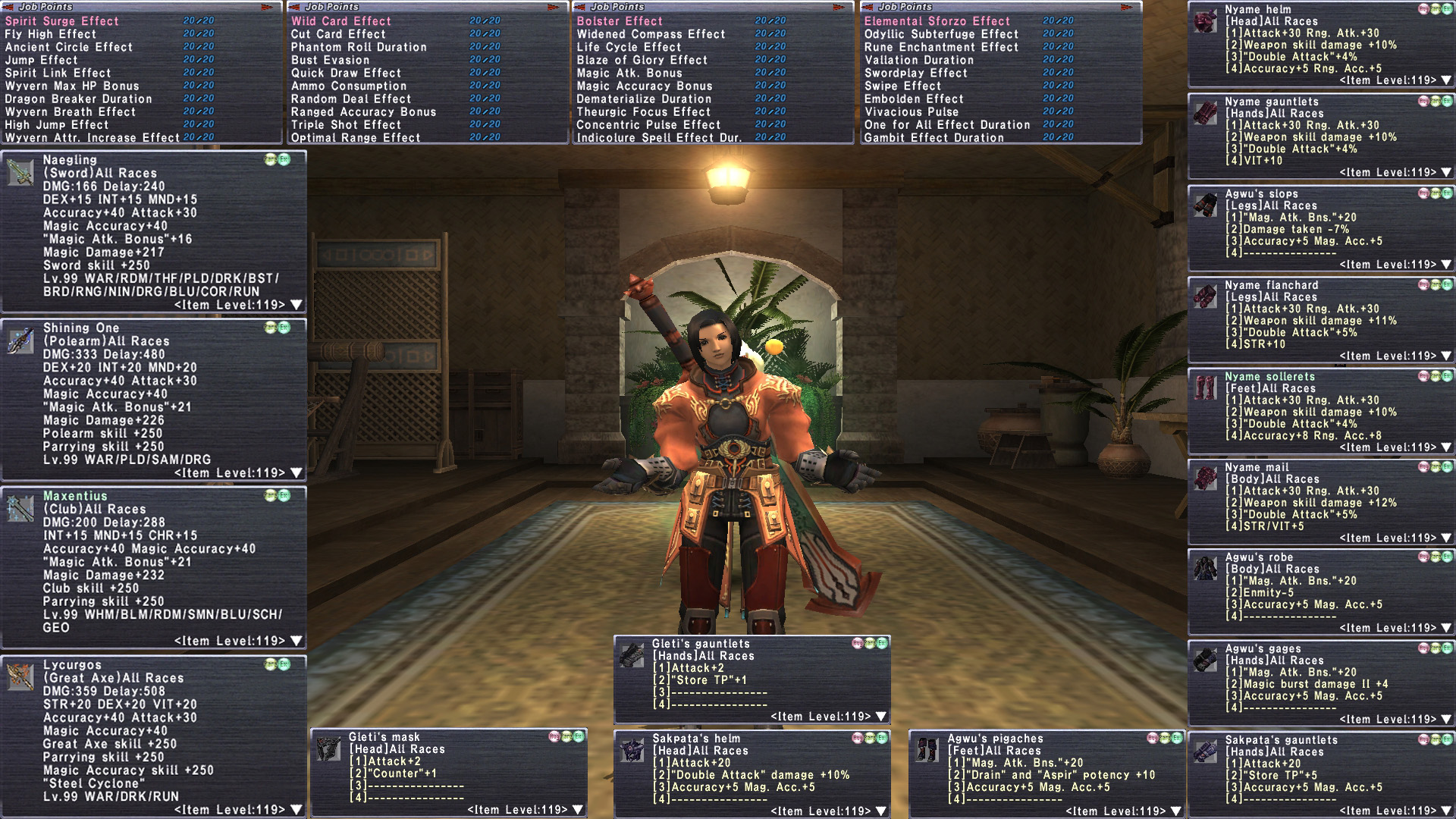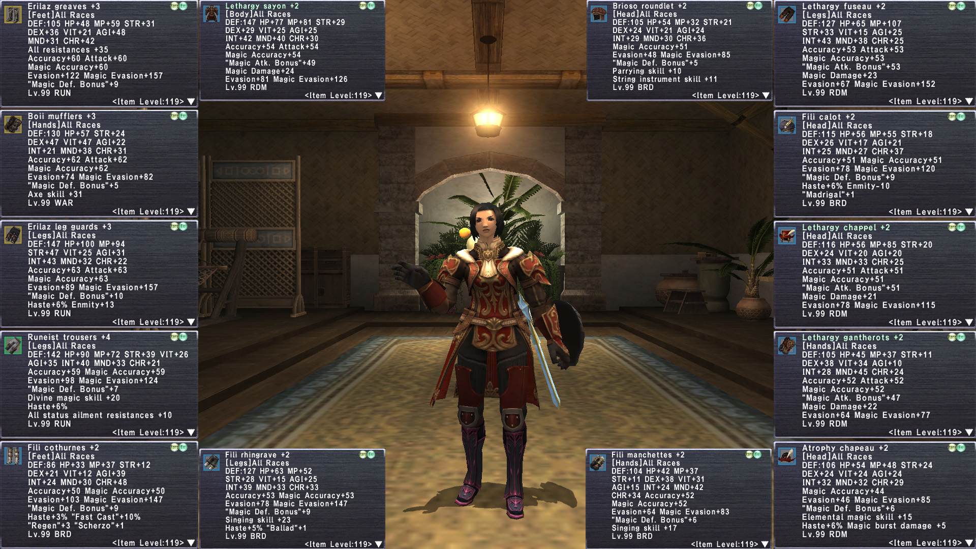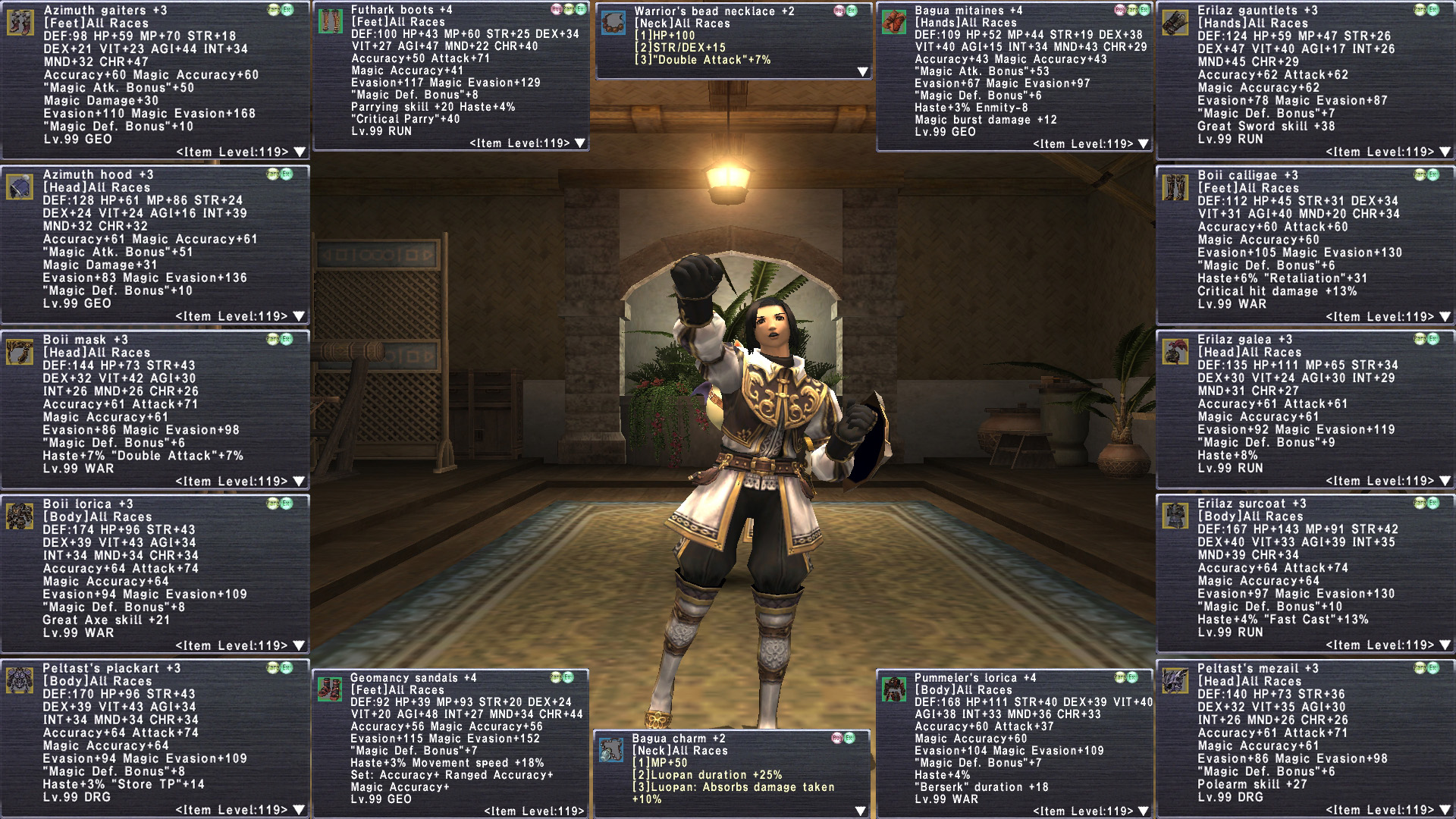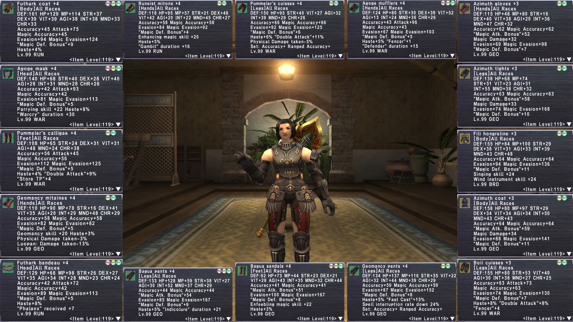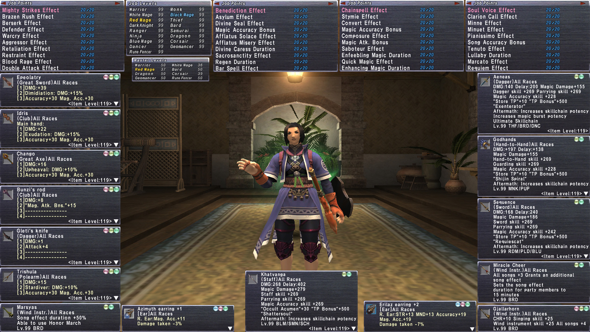 tldr Great Hume Female super up to date with LOTs of Limbus+4. 6/6 Legend. Epeo RUN, Idris Geo, Chango/Savage WAR, Godhand Monk. Up and coming Bard with Ghorn/Marsyas. R15 Trishula DRG. Good Ody progress with R25 Nyame , Su5+2 necks for War/Drg/Run/Geo. Lots of Omen including Ashera harness, Proper Ambuscade JSE capes. Domain Invasion, Unity+1 @R15. Heavy ML with 6 jobs at ML50. 4x Malig, Null Loop, Miracle Cheer, 195k Ichor, 996k Gallimaufry, 182k mog segs and 50k beads, Aeonic ready!