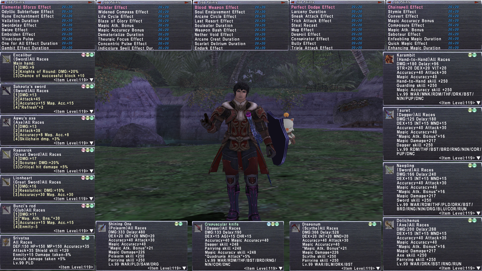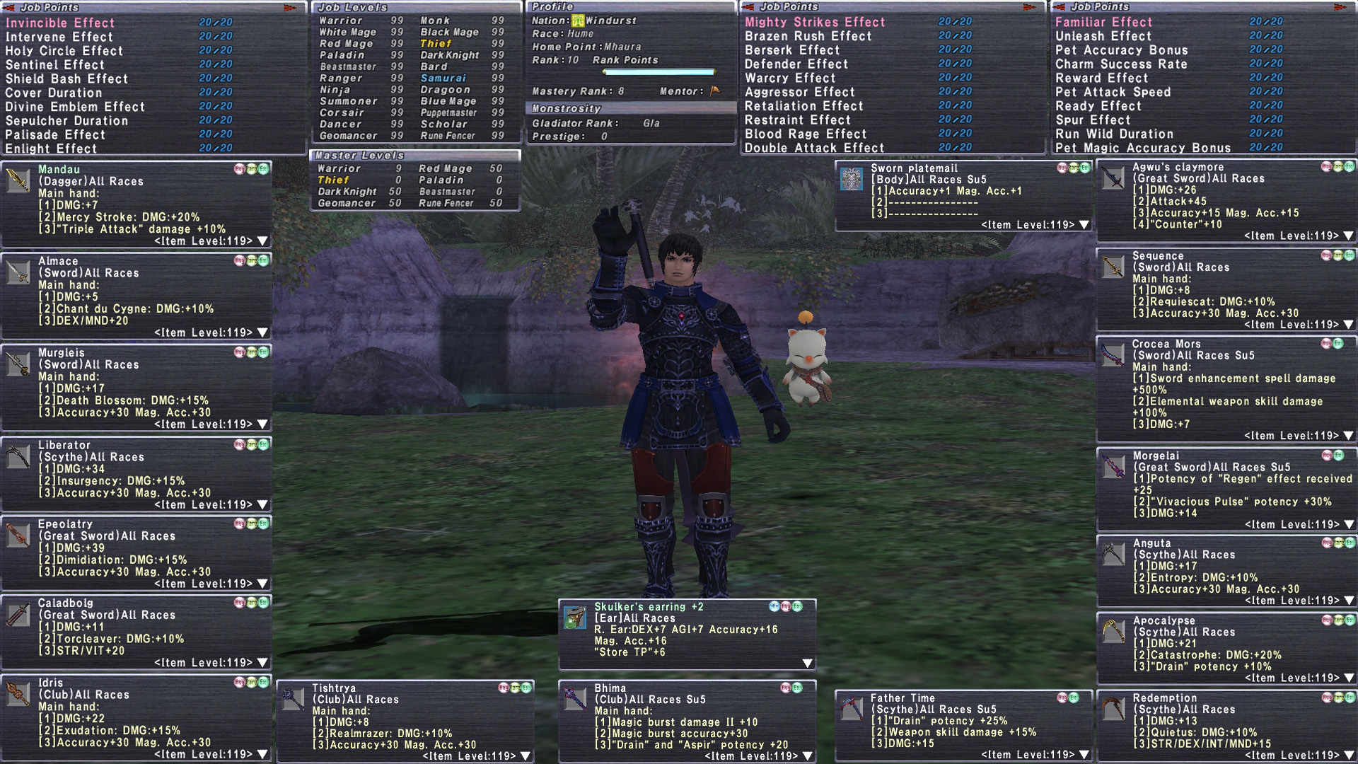tldr& Accounts this accomplished dont come around very often. Highest MR account we have ever sold! Mastery Rank 8(Hoxne Earring will give +20 to all stats at MR8). 6/6 Legend Epeo and Idris. The most well geared RDM and DRK I have ever sold. All gearsets with insane JSE capes (20 for DRK, 10 for RDM and RUN). 1070+ RoE complete. master trials. Lu Shang +1. Odyssey tons of Rank 30 gear. All Atonement 1/2/3 cleared on V25. This account can pop Bumba V25. Full 8/8 Malignance, Full Null.Tons of Sortie+3, Reforged +4. Full Hervor set, and other DI items. 30+ pieces of Unity+1. 6x Crepuscular including Knife/Cloak. Every Trust obtained 109. ML50 jobs. Massive Monstrosity(almost every specis 75+) This account is ready to go at the highest absolute level on any content with a wide variety of absolute best in slot geared jobs.
